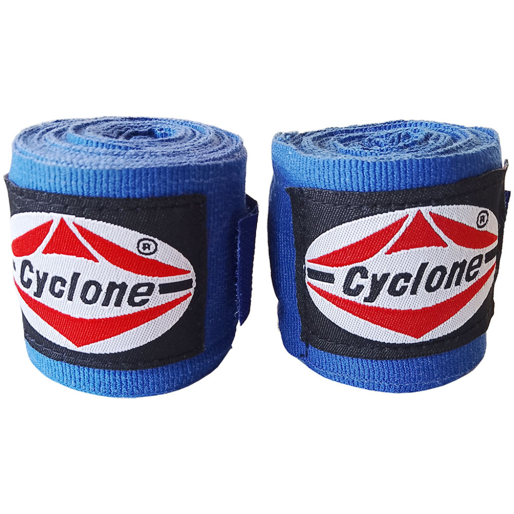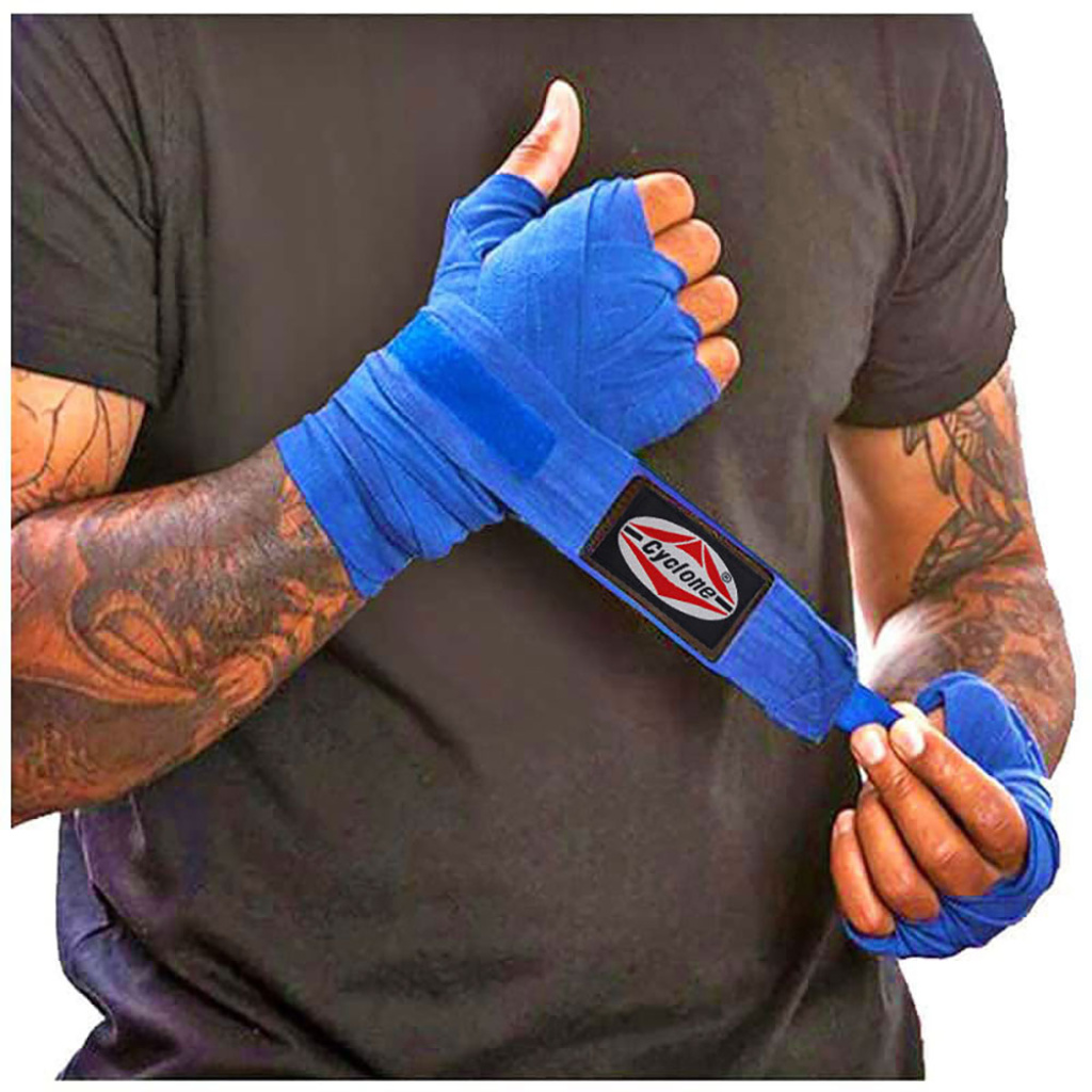 Cyclone Mavi Boks Bandajı; pamuk ve polyester karışımlı dokusuyla teri emerken el eklemleriniz için tam koruma sağlar. 3.5 metrelik uzunluğu ve baş parmak halkasıyla kolayca sarılabilir.