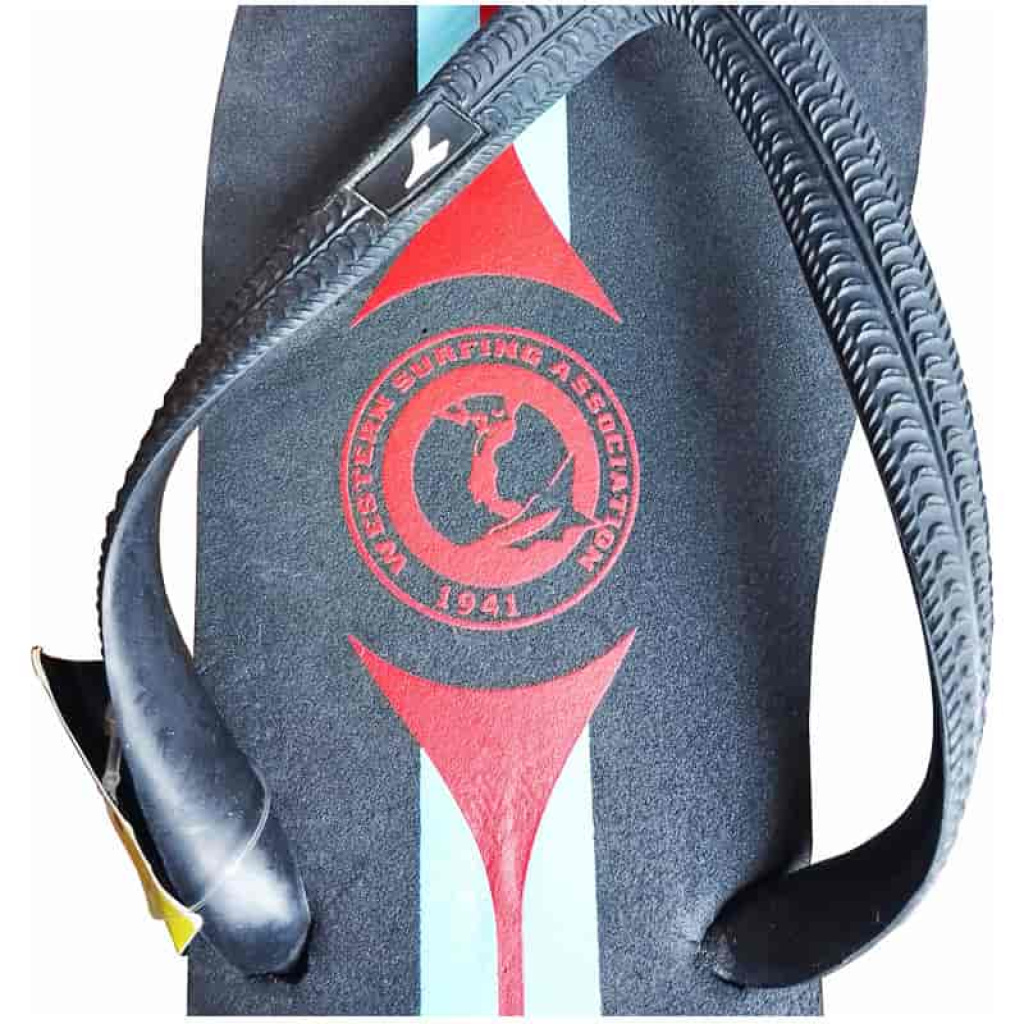 Özel Vintage İllüstrasyon: Topuk kısmında yer alan kırmızı/beyaz dairesel "Western Surfing Association 1941" logosu ve sörf figürü, terliğe sıradan modellerin ötesinde karakteristik bir hava katar.