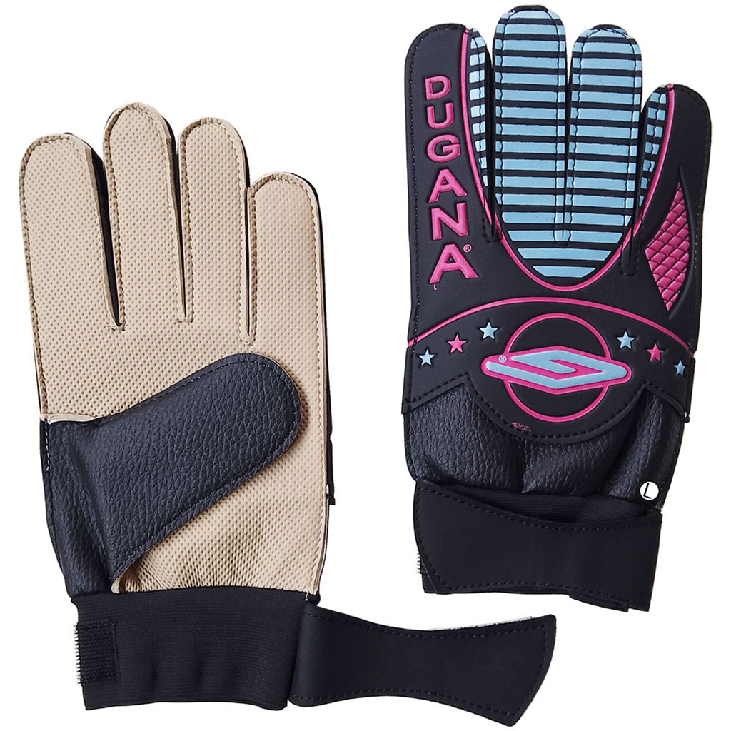 Dugana 3BAI-SPM Kaleci Eldiveni (L), gözenekli bej lateks avucuyla yüksek tutuş sağlar. Siyah-pembe gövdesi ve mavi detaylarıyla profesyonel antrenman performansı ve konfor sunar.