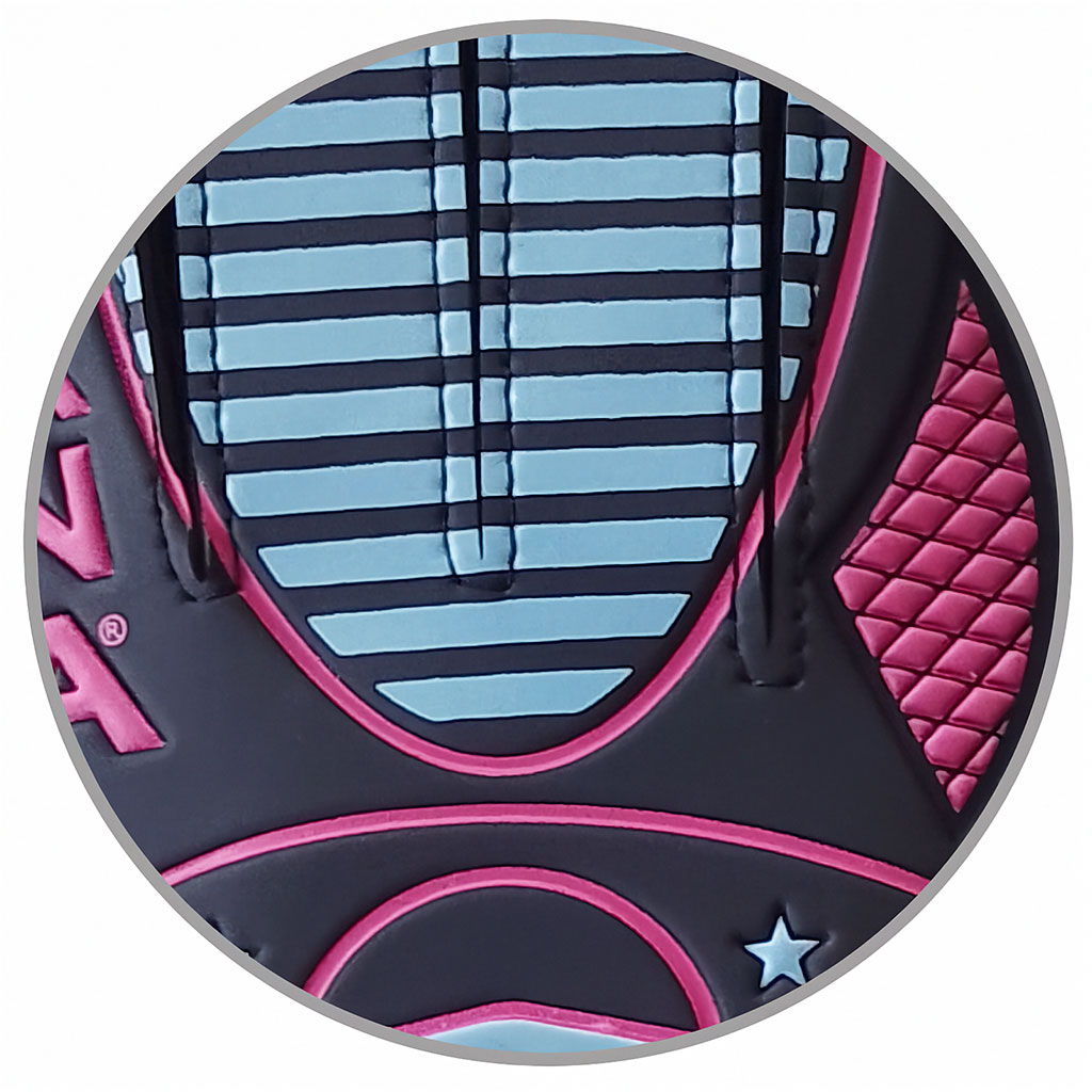Dış Yüzey: Yumuşak ve dayanıklı bir yapı sunan, estetik dikişlerle desteklenmiş sentetik deri ve kauçuk karışımı bir yüzeye sahiptir ve yanlarda pembe renkli baklava desenli koruyucu alanlar mevcuttur.