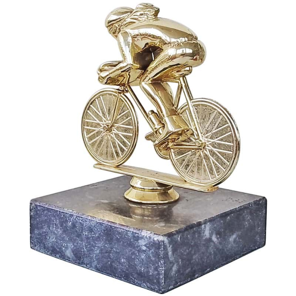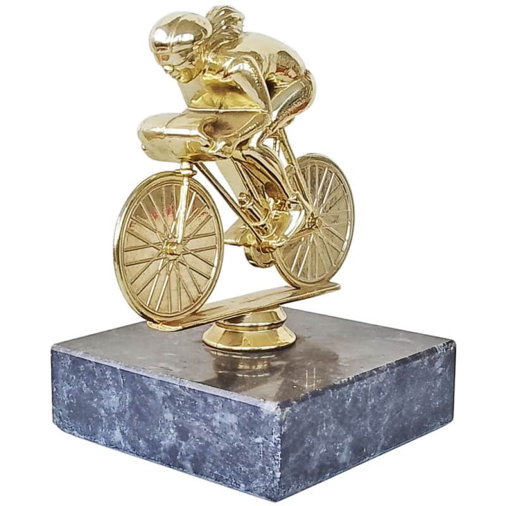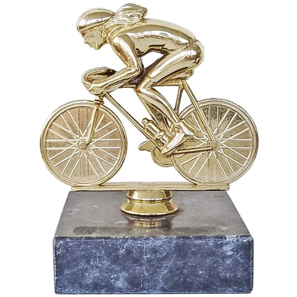 Eray figüratif bayan bisikletçi kupası, doğal mermer kaidesi ve altın renkli özel figürü ile bisiklet turnuvaları için şık bir ödül seçeneğidir. 15 cm boyutuyla dikkat çekicidir.